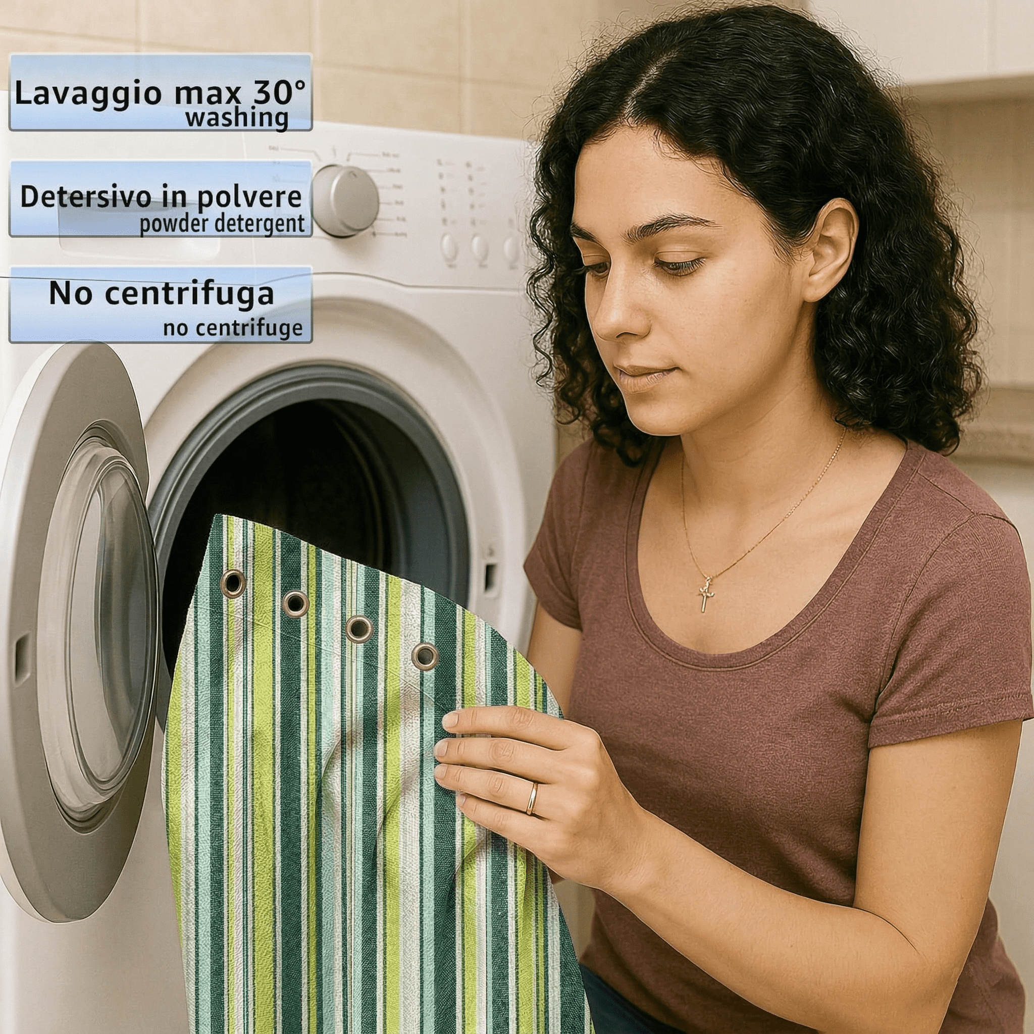 Puoi Lavare Il Tessuto A Mano O In Lavatrice A 40° Con Programma Delicati E Centrifuga Max 400 Giri, Senza L’uso Di Ammorbidenti E Solo Con Detersivi In Polvere. Inoltre, È Possibile Utilizzare L’asciugatrice E stirarla A Temperatura Media, Utilizzando Un Panno Umido Tra Il Tessuto E Il Ferro Da Stiro. Si consiglia conservarla asciutta a fine stagione.